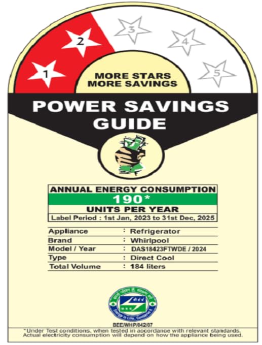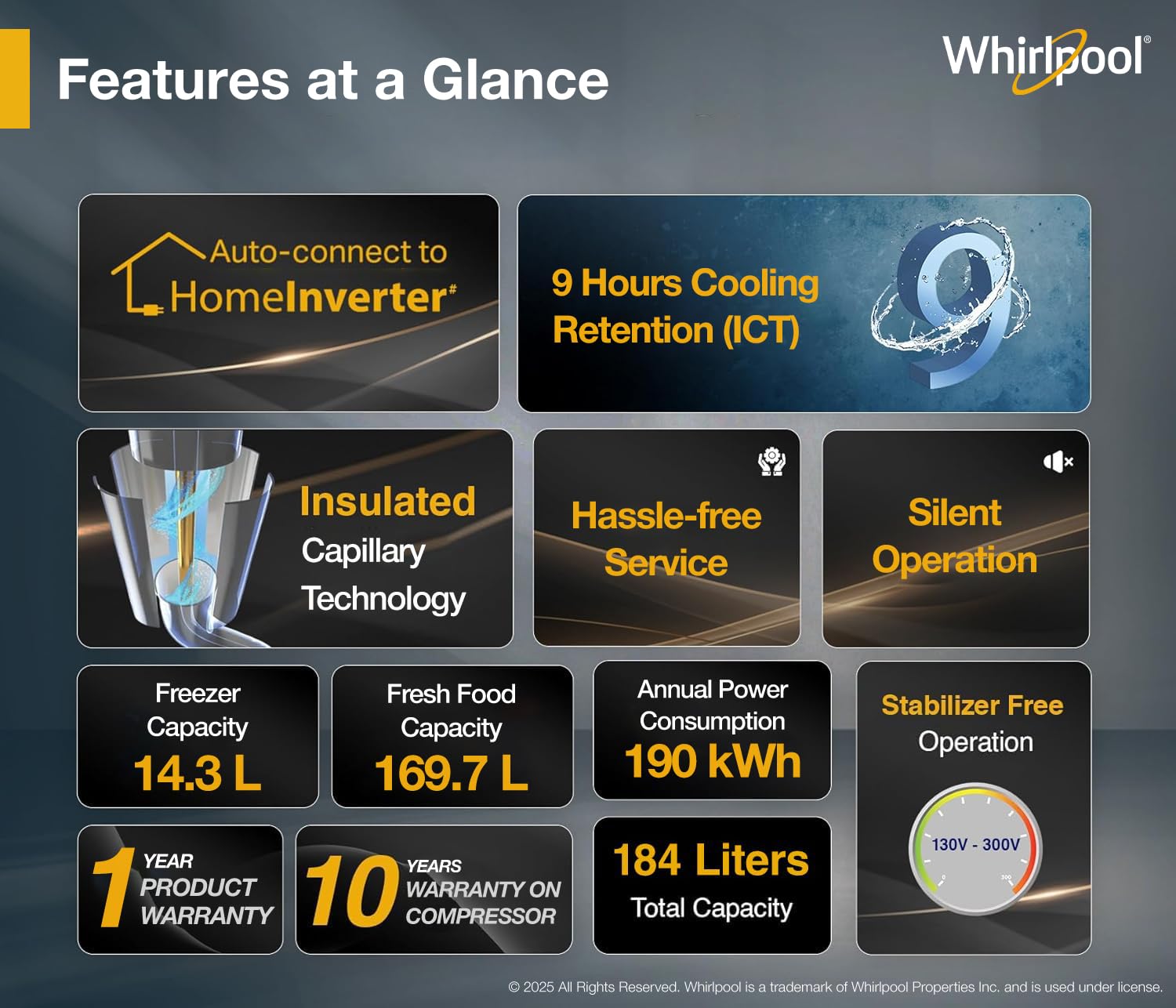 Single door refrigerator with Intellisense Inverter Technology Capacity: 184 liters for families with 2-3 members Energy Rating - 2 Star energy efficiency 1 year product warranty and 10 year compressor warranty Intellisense Inverter technology - Comes with low starting voltage of 95V & assures 25 years of compressor reliability- certified by VDE Germany *As Certified by VDE Germany Special Feature - Stabilizer free operations even in high voltage fluctuations between 95V-300V Brand Specific Features - Upto 9 hours of cooling retention during power cuts, Easy Manual Defrosting, Jumbo Storage Up To 3, 2L Bottle Storage, Insulated Capillary Technology, Auto Connect To Home Inverter, Large Vegetable Crisper, Honey Comb Lock In Technology & Quick Chill Zone Storage & Interior Description-Fresh food capacity : 169.2 Ltr | Freezer capacity : 14.3 Ltr | Total no : of drawers : 4, shelves : 2 | Shelf Type : Toughened glass shelves / Spill proof adjustable shelves / Wired shelves | Anti-bacterial gasket Item Dimensions & Weight : 60.5 x 53.5 x 118.8 Centimeters | Weight : 33.4Kg In Box : 1 Refrigerator,‎1 Egg Tray, 1 Ice Tray, 1 Instruction Manual, 1 Key }